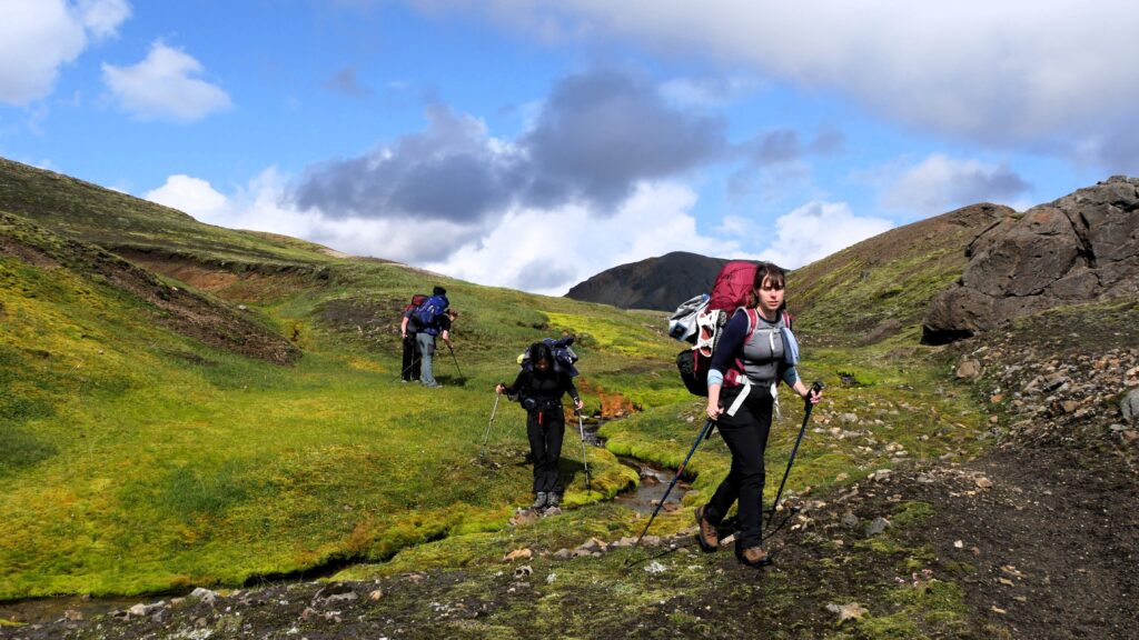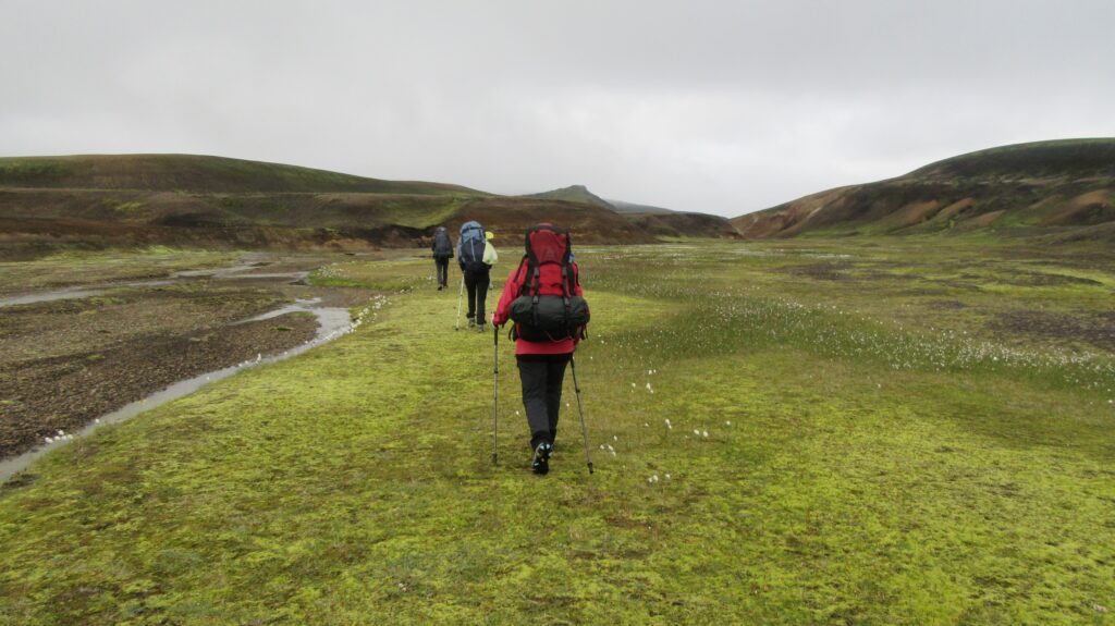 Certes, le sac est un peu lourd au début, mais les paysages grandioses nous le font vite oublier. Même si le temps n’a pas été au rendez-vous tous les jours, nous en avons pris plein les yeux, nous avons pu nous baigner dans des sources d’eau chaude et traverser de nombreux passages à gué et des étendues spongieuses. Que de souvenirs mémorables !